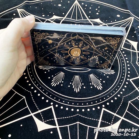 바닥에 타로 천을 깔아주고~ 종이 케이스에 들어있는 타로 카드를 꺼내보아요.
