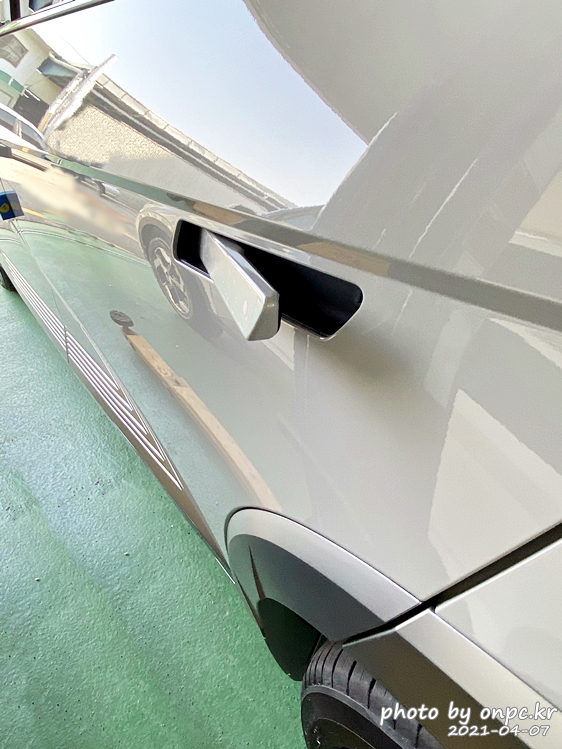 햇볕에 반사되는 빛이 나는 유광 재질로 판매용 색상이 아닌 테스트 전용 컬러(?)로 보여요. 옆에 차와 비교해보면 화이트는 확실히 아니네요.