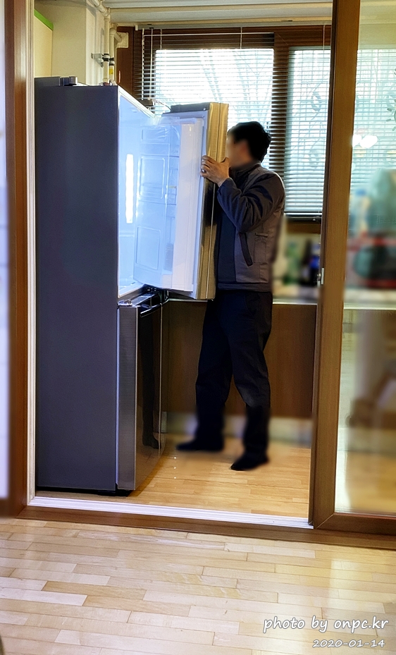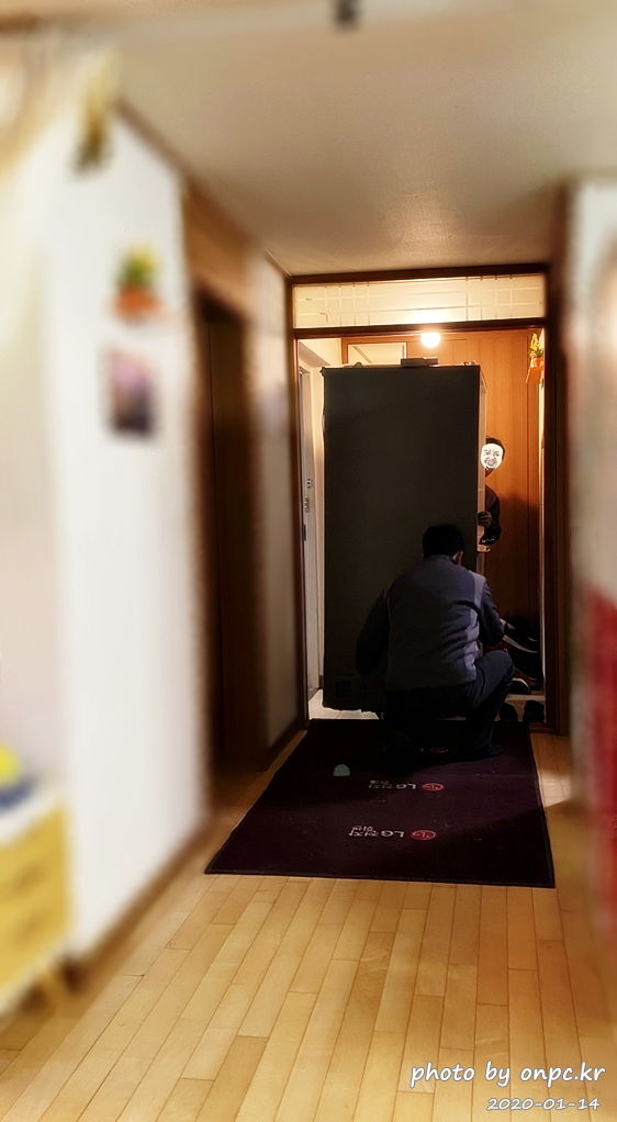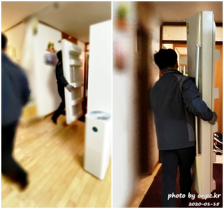 냉장고 문은 냉장고 자리 잡고 조립하는 거라 지금은 문 없이 냉장고 본체만 옮기는 중~