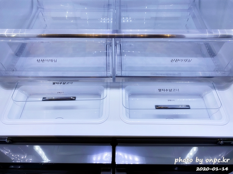 신선야채실과 멀티 수납 코너가 좌우로 똑같은 크기로 배치되어 있어요.