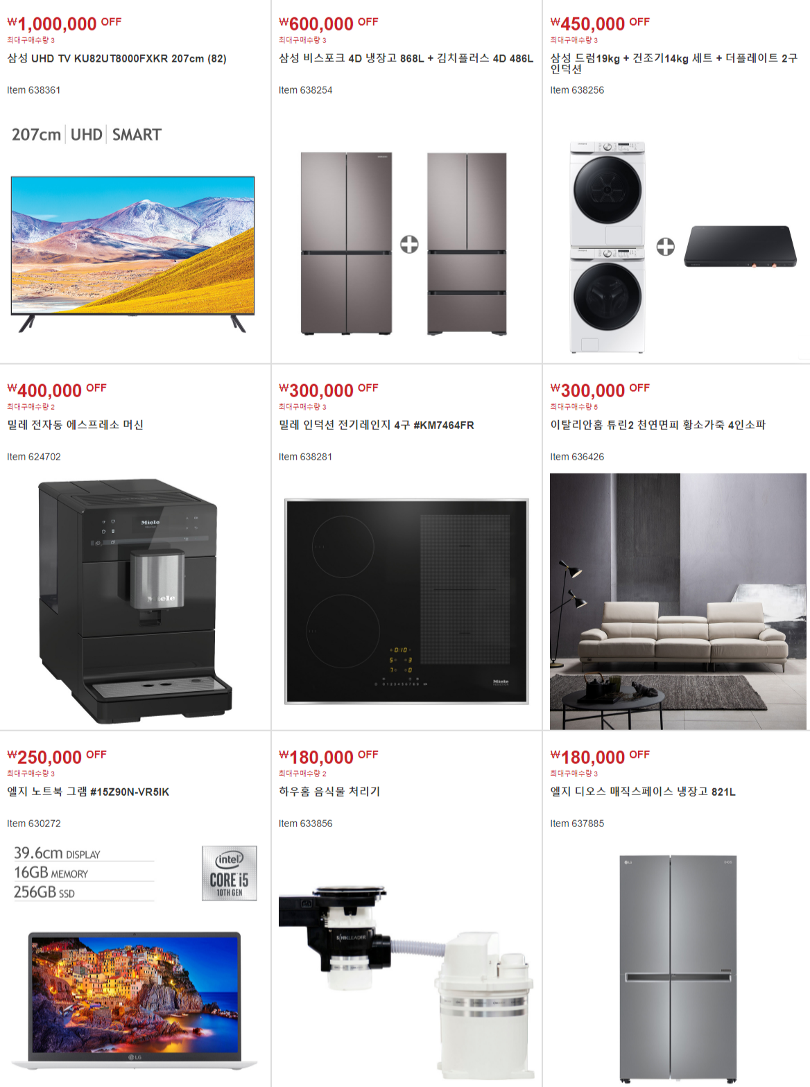 커피머신, 건조기&세탁기, 냉장고, 가구, 오븐, 히터, 가습기 등 품목이 많아서 볼만합니다.