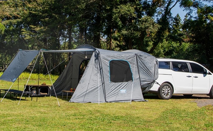 RV, SUV, 승용차 등 차량과 연결해 사용하는 터널형 카 텐트, 차량에 연결하지 않고 독립된 텐트로 설치 가능.