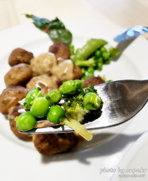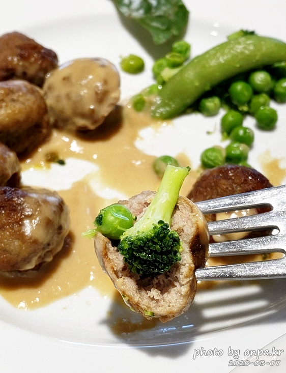 껍질콩과 브로콜리, 완두콩을 곁들이고 소스를 살짝 뿌린 미트볼 12개~
