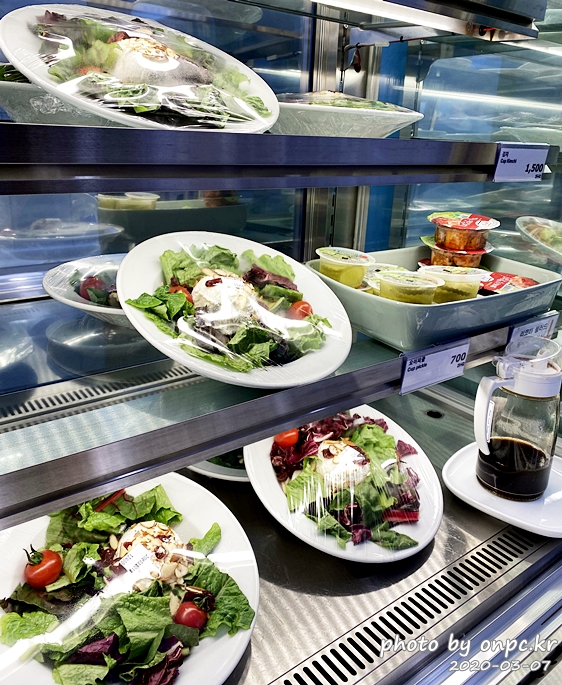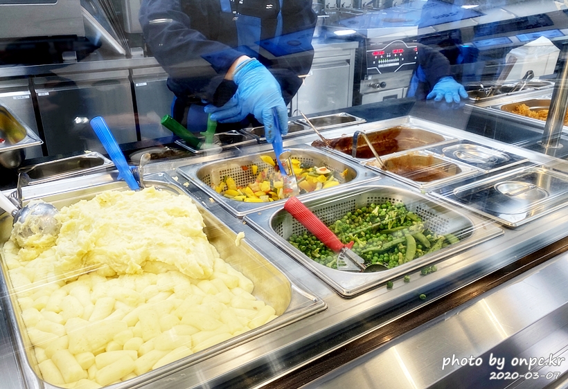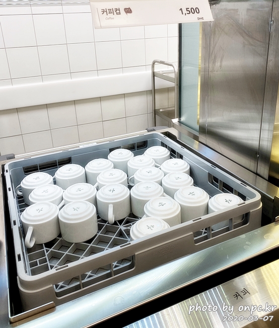 카트에 음식과 커피잔 담고 계산을 끝낸 후 테이블 갑니다.