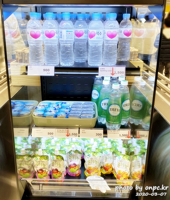 생수: 900원 / 탄산수: 1,500원 / 유기농 포도&오렌지 주스: 1,500원