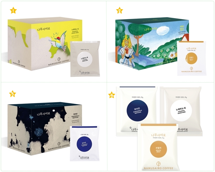 1와이칸(과테말라 산), 2노래하는 새(에티오피아 산), 3브릴리(브라질 산), 4믹스(와이칸/노래하는 새/브릴리)