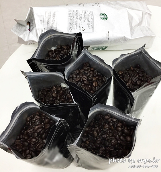 ※ 200g 용량의 커피 보관 백에 나눠 담으면 6개에 가득 채워집니다. 1,13kg의 커피양입니다.