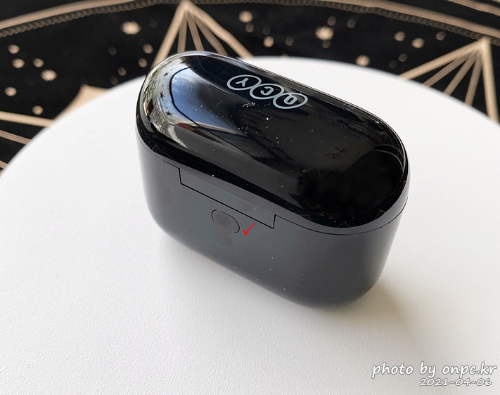 케이스 겸 충전독이에요. 상단에 QCY 로고가 새겨져 있어요.
