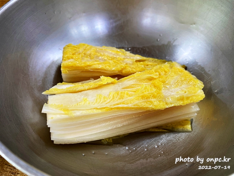 연한 배추 잎이 엄청 아삭해 보이고 시원해 보이는 예쁜 비주얼의 백김치! 침샘을 막 자극합니다.ㅎ