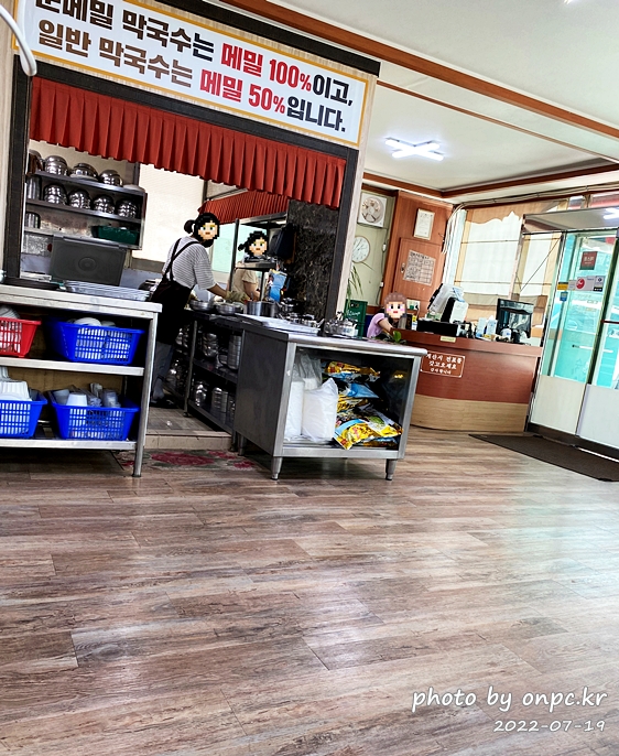 주방 입구에도 메밀 함량에 대해 크게 적혀 있어요.