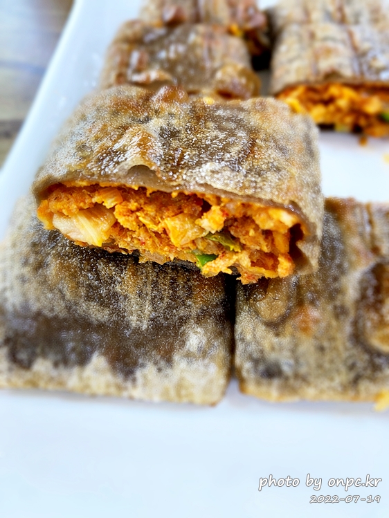 메밀의 쫄깃함과 바삭함~ 살짝 매콤한 김치와 당면, 두부 등 재료가 골고루 들어 있어요. 속이 꽉 차고 맛있어요.