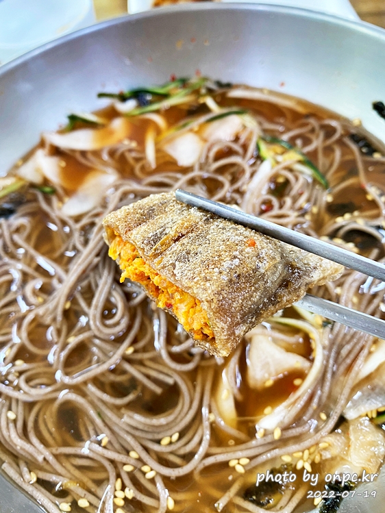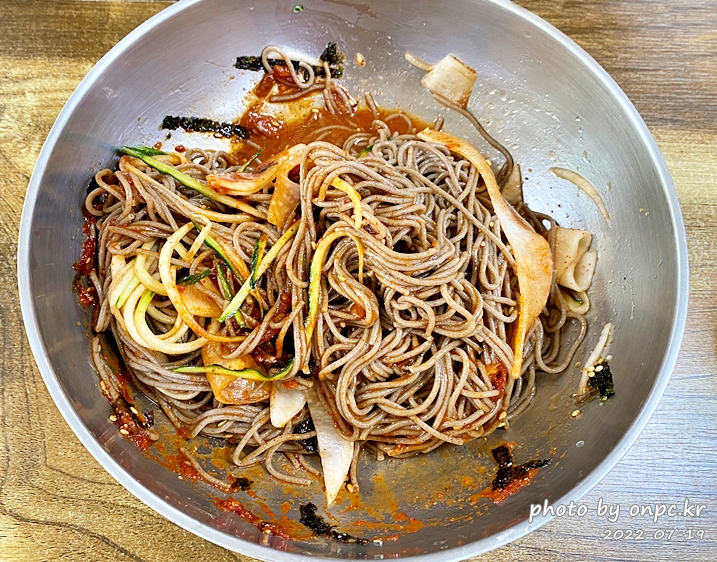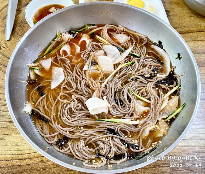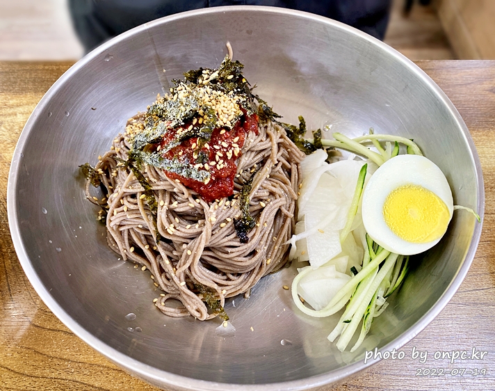 메밀 면의 검은빛만 없으면 들어가는 재료가 비슷해서 얼핏 밀면 같아 보입니다.
