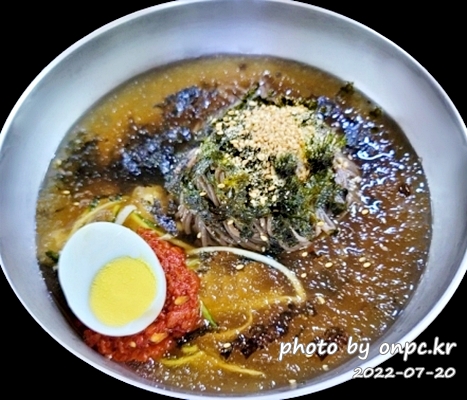 돌돌 만 메밀 면 위에는 깨와 김가루가 소복이~ 육수에는 비빔 양념, 무절임, 채 썬 오이, 삶은 계란이 올려져 있어요.