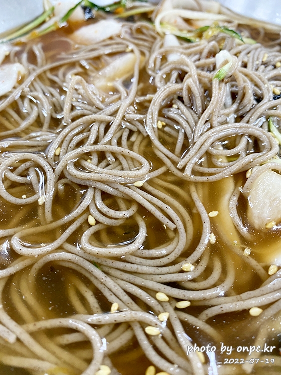 살얼음으로 육수가 시원해서 좋은데 순메밀로 먹을 땐 면이 더 퍽퍽하고 뚝뚝 끊어지는 느낌이 들어 별로였어요.