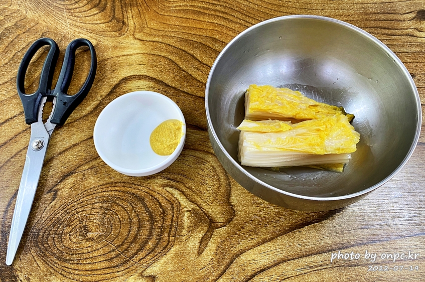 먼저 기본 반찬으로 나온 노란 겨자와 노란빛의 백김치~