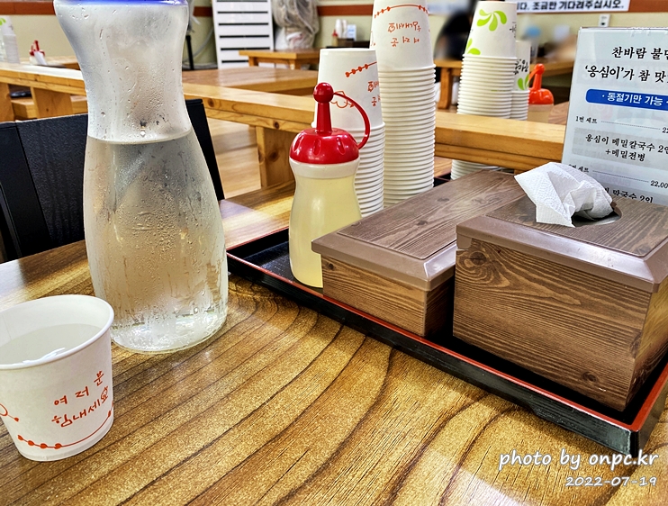 테이블마다 종이컵과 식초가 비치되어 있어요.
